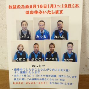 8月16日㈪〜19㈭がお盆休みとなります
