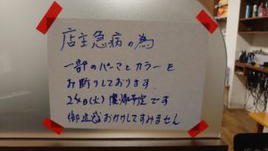 大変申し訳ございませんが、家族の新型コロナ感染のため、濃厚接触者となり、1月18日㈬〜23日㈪まで店主のみお休みさせていただきます