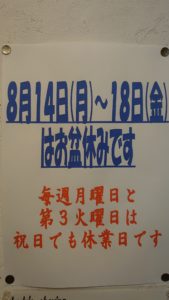 上記の通り8月14日(月)~18日(金)までお盆のためお休みいたします