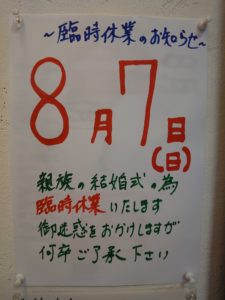 タイトルにもありました通り、8月7日㈰、何度も延期になっておりました義弟の結婚式参加のため、臨時休業させていただきます